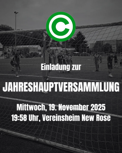 EINLADUNG an alle Vereinsmitglieder gemäß § 13 Nr. 2 und 3 der Satzung zur JAHRESHAUPTVERSAMMLUNG (Generalversammlung) mit Vorstandswahlen am MITTWOCH, 19. November 2025, 19:58 Uhr, Vereinsheim New Rose, Eschersheimer Landstr. 328, 60320 Frankfurt. Bereits ab 18:00 Uhr wird gegrillt. Hierzu sind alle Mitglieder herzlich eingeladen. TAGESORDNUNGSPUNKTE: 1. ERÖFFUNG 2. ANTRÄGE des Vorstands zur Satzungsänderung und…