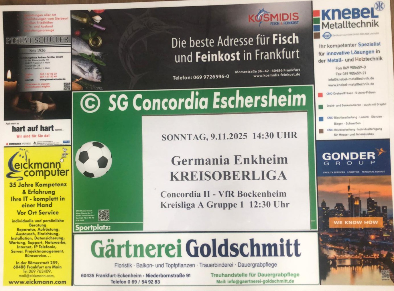 Sonntag 14:30 Uhr KOL 6. November 2025 | Keine Kommentare Sonntag, 9.11.2025 um 14:30 Uhr gegen Germania Enkheim KREISOBERLIGA Concordia II – VfR Bockenheim Kreisliga A Gruppe 1 12:30 Uhr News